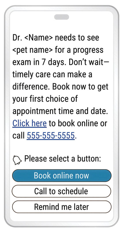The 2026 economic outlook for veterinary practices is concerning, with visits, client numbers, and revenue trending downward.1 Veterinary appointments reportedly declined by 2.8 percent during the last 12 months.2 Because full schedules ensure healthy profits, experts advise aiming for an appointment fill rate of 85 percent.3 Exceeding 90 percent capacity could lead to less same-day appointment availability for sick patients, turn away new clients who can’t get timely care, and risk team burnout. Fill rates below 80 percent will hurt profits and limit employee wages. To calculate your appointment fill rate, take the number of appointments seen divided by the number of available appointments. If your appointment fill rate drops below 85 percent, use these four strategies to fill empty slots: 1) Schedule progress exams at the end of visits When acute issues, chronic diseases, or procedures require follow-up care, schedule progress exams as you wrap up each appointment. You will have more appointment availability and ensure timely care. Say “progress exam” and never “recheck” Clients may misinterpret “recheck” as optional and free care. The word “progress” shows you are moving forward in resolving the health concern and reiterates that follow-up care is medically necessary. Book follow-up care in exam rooms In dental practices, hygienists have greater success with pre-appointing patients than scheduling coordinators at checkout.4 By the time clients reach the checkout counter, they want to leave and may dismiss staff attempts to schedule. To improve compliance with follow-up care, have technicians book progress exams in exam rooms. If you don’t have computers in exam rooms and clients must schedule appointments at the front desk, put alerts in patient records so client service representatives (CSRs) know to schedule progress exams. Lead clients to schedule Pick the same weekday and time or use the yes-or-yes technique when booking follow-up care. Share benefit statements, such as getting the first appointment choice. Use the action word “needs” to indicate follow-up care is medically necessary instead of the wiggle word “recommend.” Book with the same veterinarian for exam efficiency and continuity of care. Say, “Dr. needs to see in 10 days for a progress exam for the ear infection. Does this same time on fit your schedule?” Another opportunity is the yes-or-yes approach. Say, “Dr. has progress exams available on <date, time 1> or <date, time 2>. Which do you prefer?” Contact clients who don’t book Enter a medical callback or automated text. In this ear infection scenario, call the client or send a text three days later when seven days remain before follow-up care will be due, ensuring appointment availability (Figure 1). Figure 1. Graphic courtesy Wendy S. Myers 2) Offer online booking—especially for new clients New clients account for eight percent of practice revenue but were reportedly down 8.6 percent in 2024.5 Offering online scheduling is a key strategy to attract new clients. Veterinary practices’ utilization of online booking grew 87 percent in 2025.6 New clients made 23 percent of online appointment bookings, and 37 percent of all online appointments were scheduled after business hours. “Direct Booking has paid for itself. Being able to generate more appointments with new clients has been a benefit,” says Vincent Mancini, DVM, owner of Bonita Veterinary Hospital in Bonita Springs, Fla. Millennials have digital-first preferences As the largest segment of pet owners (33 percent), millennials overwhelmingly prefer online scheduling and forms.7 As the first generation to grow up with the internet, they find digital tools more convenient and efficient than traditional methods like phone calls and paper forms. Send confirmations with digital forms upon booking Your client communications platform can automatically send text and email confirmations with new client forms. This lets you set up the medical record and request records from a previous veterinarian or adoption paperwork in advance. Enjoy faster check-ins New clients can share patient details, including breed, birthdate, vaccine status, reproductive status, and more, through online forms—avoiding paperwork that could take up to 15 minutes during the appointment. 3) Move patients up to fill openings Shifting patients up in the schedule to fill empty slots is known as “schedule optimization.” This strategy improves efficiency, resulting in fewer schedule gaps and more consistent patient flow. A veterinarian saw an average of 15 patients per day in 2024.1 Let’s say the doctor has seven empty slots on Tuesday. Look for sick pet appointments on Wednesday and Thursday that could be rescheduled for Tuesday. This fills empty slots, prioritizes scheduling for ill patients, and enhances client satisfaction. Keep a wait list of clients who want to be seen sooner. Fill cancellations or no-shows from your wait list. Text will be the fastest way to reach clients about newly available appointments. 4) Forward book wellness appointments Wellness appointments account for 24 percent of visits and are falling behind 2.9 percent.9 When a client visits for a pet’s wellness appointment, book the next care six or 12 months in advance, filling your future schedule. An American Animal Hospital Association (AAHA) report found that increasing forward booking appointments from 5 percent to 10 percent could grow revenue by three percent.10 Build your schedule 12 to 18 months out Don’t worry if veterinarians’ schedules change. Doctors will request time off in advance for vacation and conferences, especially when booking travel. Simply contact clients with forward-booked appointments that need to be moved. Pre-block wellness appointments In my online course on Scheduling Mastery (https://csvets.info/SchedulingMastery), I teach how to pre-block four wellness appointments in each doctor’s daily schedu