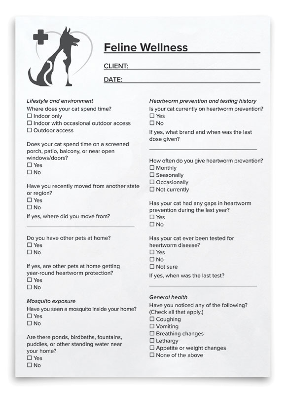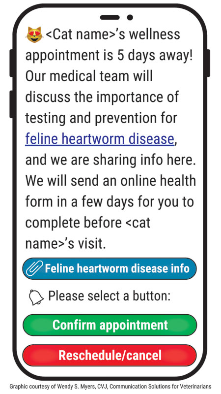 Bigstock You’ve heard clients say, “Indoor cats aren’t at risk” or “Heartworms only affect dogs.” During the last five years, Banfield saw a 47 percent rise in cats diagnosed with heartworms.1 Replace myths with facts during National Heartworm Awareness Month—and keep conversations going year-round. Here are six ways to elevate feline heartworm disease education: 1) Send pre-appointment education with confirmations Five days before wellness visits, send cat owners appointment confirmations with educational information about feline heartworm disease. Depending on your client communication platform, you can include a hyperlink, attach a client information sheet, or have a button that links to your webpage on feline parasite protection (Figure 1). Figure 1. Send pre-appointment education five days before wellness visits. When cat owners learn about feline heartworm disease in advance, they will be prepared for exam conversations about testing and prevention. Use emojis to increase open rates for texts and emails. Text formatting capabilities vary by platform, but the wordingand graphics shown here reflect communication best practices. Sharing information about feline heartworm disease in advance lets clients come ready with questions. Get ideas for your pre-appointment education from the American Heartworm Society (AHS) and Companion Animal Parasite Council (CAPC). 2) Send online health forms Two days before feline wellness appointments, clients will get another confirmation and an online health form to complete and submit before the visit. Organize questions by category (Figure 2) and keep them heartworm-focused. Ask follow-up questions to clients’ answers and assess their knowledge of feline heartworm disease, testing, and protection. Figure 2. ADOBESTOCK: LOGO BY JOAQUÍN, BLANK PAPER IMAGE BY LIFESTYLE GRAPHIC 3) Create slideshows that simplify the science Instead of a TV in the lobby—which adds noise and outside content—display an educational slideshow. Share infographics from the AHS on how heartworms are transmitted, the heartworm lifecycle, testing, treatment, and prevention,2 and include local heartworm prevalence maps from the CAPC.3 Feature your preferred brands and explain how they protect pets from multiple parasites, including heartworms. Put slideshows on exam computers, too. Use slideshows during client conversations and as screensavers when computers hibernate. Repurpose slides as social media posts and website pages. 4) Display products in exam rooms Place sample boxes of your preferred brands on cabinet countertops or wall-mounted floating shelves. (Tip: Display empty boxes to prevent theft of high-value medications.) Have a frame or laminated card with product prices and in-clinic rebates. This shows why pet owners should buy parasite protection from your hospital. Displays often prompt clients to ask about products or refills before you start conversations about heartworm protection. 5) Write a team script Have technicians, assistants, and client service representatives work together to craft the message. Consistency will bring clarity and confidence, inspiring client trust and better patient care. Have a few sentences that summarize how cats get heartworm disease, why testing matters, and how to prevent it. Say, “Mosquitos spread heartworms to both dogs and cats. When a mosquito bites an infected animal, it picks up tiny larvae and can pass them to a cat with its next bite. In cats, the immature worms that reach the lungs can cause inflammation known as heartworm-associated respiratory disease (HARD). Signs can be subtle—coughing, vomiting, or decreased appetite. The AHS guidelines strongly recommend annual testing.4 Year-round prevention is essential because there’s no treatment for cats. Let me tell you about the prevention <cat name> needs, how to use it, and the cost with our in-clinic rebates.” Encourage staff to share personal stories about their cats’ prevention routines. Explain what you like about the brand, how you remember to use it consistently, and why you believe in year-round protection for your cat. 6) Don’t give up if clients decline testing and prevention Keep your response supportive to protect the relationship and leave the conversation open. Provide a brochure or email resources so clients can learn more about feline heartworm disease.5 Say, “Thanks for letting me know your decision. Heartworms come from mosquitoes, even indoors, and there’s no treatment for cats, which is why we advise testing and prevention. If you want to revisit it or notice coughing, vomiting, or breathing changes, just reach out. We’re here to help.” Consider one extra effort. Put the heartworm protection in the client’s cart in your online pharmacy, which will trigger an email to the client who can choose to enter payment and place the order or delete it from the cart. It’s a non-confrontational way to give clients a second opportunity. Revisit your heartworm conversation at the next visit—repetition gets results! Wendy S. Myers, CVJ, trains veterinary teams to communicate with clarity and confidence, inspiring client trust and better medical care. Founder of Communication Solutions for Veterinarians, she teaches proven skills through online courses, conferences, and consulting. Myers’ experience as a partner in a specialty and emergency hospital gives her insight into practice challenges. Explore her online training at CsvetsCourses.com. References New pet owner survey suggests common myths fueling significant gap in prevention of deadline parasite for U.S. dogs and Cats. Banfield Pet Hospital. Accessed February 2, 2026. https://www.banfield.com/about-banfield/newsroom/press-releases/2024/survey-shows-common-myths-fueling-gap-in-dog-parasite-prevention https://www.heartwormsociety.org/pet-owner-resources/infographics https://capcvet.org/maps/#/ Feline guidelines for the prevention, diagnosis, and management of heartworm (dirof