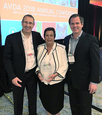 Kim Allen (center), president of Henry Schein Animal Health’s commercial division, has received the American Veterinary Distributors Association’s 2018 Lifetime Achievement Award. Kim Allen, president of Henry Schein Animal Health’s commercial division, has been honored with the American Veterinary Distributors Association’s (AVDA) 2018 Lifetime Achievement Award. Allen, who has worked in the veterinary distribution industry for more than 36 years, was the first woman to join the AVDA board of directors, serving from 1990 to 2005 and as chair from 2001 to 2004. “Kim’s dedication and service to the animal health industry and distribution for more than 36 years is truly remarkable,” said Paula Brown, AVDA chair. “She was a role model and mentor for me and many other women in the industry. Her support of AVDA as a board member and first woman chair was groundbreaking and helped to make the association better for all of our members.” Allen, who received her bachelor of science in animal science from Rutgers University, joined Henry Schein in 2005. Prior to that, she worked in various senior executive positions in the veterinary distribution industry, including president of Burns Veterinary Supply for the Darby Group Companies. An avid horse rider and breeder, Allen is also a member of the U.S. Equestrian Federation, U.S. Dressage Federation, and U.S. Eventing Association. “I am honored to receive the AVDA’s Lifetime Achievement Award, and I thank this wonderful organization for helping distributors navigate the ever-changing animal health landscape,” said Allen. “Throughout much of my career, the AVDA has been an invaluable partner in our industry’s efforts to help veterinary professionals build stronger practices and deliver high quality care to their patients, and I look forward to seeing how we are able to continue moving forward for the benefit of animal health.”