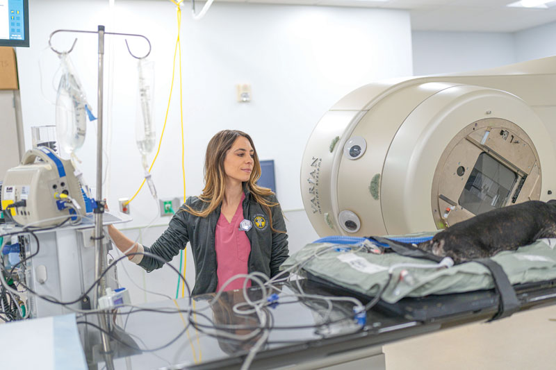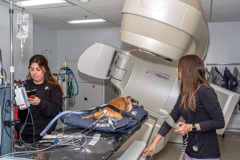 Katja Guevara, RVT, and Gabby Hovey, RVT, prepare a dog for radiation therapy on the linear accelerator. PHOTO COURTESY MICHAEL BANNASCH, UC DAVIS SCHOOL OF VETERINARY MEDICINE In late 2023, Klydee, an 11-year-old female terrier mix owned by Jeanne Maeda and Lori Tsuhako of Honolulu, Hawaii, developed a bulging right eye and worsening vision that ultimately led to blindness. Klydee was evaluated by a surgical oncologist in Honolulu, who identified a mass at the back of her right eye, arising from nervous tissue. Klydee’s tumor was initially removed, but tumor cells were left behind. Because radiation therapy is not available in Hawaii, the dog was subsequently referred for radiation therapy at the UC Davis School of Veterinary Medicine’s Comparative Cancer Center. When Klydee was evaluated by the radiation oncology team, a second tumor in her brain was found, and there were concerns her initial tumor was regrowing in the front of her brain, causing multiple lesions. The neurosurgery team was brought in to remove her cancerous tissue. It was a delicate procedure because her tumors were in critical areas of the brain and the risk of complications was high. Neurosurgeons Ji-Hey Lim, DVM, PhD, DACVIM (Neurology), Adrien Dupanloup, DVM, DACVIM (Neurology), and Vishal Murthy, DVM, DACVIM (Neurology), who specialize in complicated brain surgeries, turned to a new, state-of-the-art surgical microscope, a gift from the Meadowview Foundation, to save the patient. The microscope provides much higher magnification and lets doctors view areas that were previously all but impossible to see through an endoscope, enabling less invasive tumor removal and cleaner margins. “Margin identification is one of our main goals when treating dogs and cats with brain tumors; it is also the center of our research program with this microscope,” writes Dr. Dupanloup in the Fall 2025 issue of UC Davis’ CCAH Update.1 “We are exploring how to achieve the smallest margin and increase our chance to get all of the mass.” The surgery was a success, and Klydee returned home after completing a course of radiation therapy to try to keep the tumor from recurring with zero brain deficits. The dog continues to do well today. A growing facility Klydee is just one of the nearly 3,000 animals reportedly brought to UC Davis annually for the diagnosis and treatment of cancer. In recent years, the UC Davis Comparative Cancer Center has added a wide array of innovative equipment and oncology specialists. The facility was established in 2007 as an offshoot of the earlier Cancer Biology in Animals program, and integrated expertise from the School of Veterinary Medicine and the UC Davis NCI Designated Comprehensive Cancer Center, which received its designation in 2012. The Comprehensive Cancer Center is unique in that it was the first program in the U.S. to focus on cancer research across species. The veterinary cancer center currently utilizes 18,000 sf of clinical/research/administration space. This will reportedly increase to 36,000 sf by the end of the decade, when other clinical services currently in that space move to new facilities. Treating animals with cancer is the center’s primary mission, but as its name suggests, its work extends far beyond that, according to Michael Kent, DVM, MAS, DACVIM (Oncology), DACVR (Radiation Oncology), DECVDI (Radiation Oncology), director of the Center for Companion Animal Health and Co-Program Leader of the Comparative Oncology Program. “UC Davis is a Comprehensive Cancer Center, which is a designation given out by the National Cancer Institute (NCI) to select human cancer centers around the country,” Dr. Kent says. “The Comparative Oncology Program is part of that as one of its science programs, and one of our goals is to see what we can learn in animals to help advance human cancer treatment.” The veterinary program puts an emphasis on translational research and offers pathway programs to encourage students to pursue oncology research. “Through our DVM Ph. D program, students can receive an Institutional National Research Award from the NIH, which supports those building a career in comparative oncology,” Kent says. “We train residents in medical oncology, radiation oncology, and surgical oncology, as well as related fields such as dental and oral surgery and neurology. The different services all work together to provide comprehensive patient care. We also work closely with our diagnostic imaging people at our All Species Imaging Center.” Gabby Hovey, RVT, prepares a dog for radiation therapy on the linear accelerator. PHOTO COURTESY MICHAEL BANNASCH, UC DAVIS SCHOOL OF VETERINARY MEDICINE The All Species Imaging Center was established in September 2025 and is located adjacent to the UC Davis William R. Pritchard Veterinary Medical Teaching Hospital (VMTH). It includes four diagnostic imaging suites, two control rooms, a patient holding room, a radiologist’s interpreting room, and office space for technical staff. The four imaging suites are dedicated to small animal computed tomography, high-field magnetic resonance imaging for both small and large animals, positron emission tomography/CT for both small and large animals, and a dedicated large bore equine CT. “With these advanced scanners, we have been able to image areas of animals that we had never been able to scan before, such as the lumbar spine of horses and cows, the pelvis and stifles of horses, a full equine cervical spine, and the abdomen of a llama,” says Mathieu Spriet, director of Imaging Services at the VMTH, in a release.2 The All Species Imaging Center is a major step forward, but the addition of state-of-the-art diagnostic technology began years earlier. In 2018, for example, the VMTH received a new PET/CT scanner, the Mini Explorer II. Designed to provide veterinarians with both anatomic and physiologic information, it reduces scan time as a result of a wider PET detector. Added benefits inc
