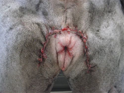 The solution to some chronic urinary tract infections is not always antibiotics. When female dogs present excessive or redundant skin folds dorsally and laterally to the vulva, a cascade of events often follows. Common complaints from the owner include excessive licking of the vulvar area, scooting, malodor, hematuria and sometimes urinary incontinence. How can a simple skin fold cause urinary incontinence? The redundant skin fold acts like a dam and enables urine retention. Moisture, body heat, darkness and accumulation of skin debris create an ideal environment within the skin folds for bacteria to proliferate and cause local infection. The two main challenges are assessing precisely how much skin to remove, and closing the surgical site in a cosmetic manner. After vulvoplasty, the vulva becomes visible.(Courtesy of Dr. Zelztman) Friction between the two skin surfaces causes microtrauma, which adds to self-trauma via licking and scooting. This leads to skin fold dermatitis or pyoderma. In turn, secondary vestibulitis, vaginitis or ascending UTIs have been reported. At worst, urinary incontinence can occur. The poster child for this condition is an overweight female dog with a hypoplastic or recessed vulva. The mean weight was 71 pounds in a fairly recent study.1 Another study reports the condition in medium to giant breeds, except for one bichon frise.2 The mean age is approximately 3.5 years in both studies. The diagnosis is confirmed by careful observation of the redundant skin folds and the dermatitis. A speculum may be helpful. Medical management entails using systemic antibiotics and topical treatments, as well as weight loss. The results are “generally palliative and unrewarding.”1 The definitive treatment is episioplasty or vulvoplasty, which is the surgical excision of the redundant perivulvar skin folds. This reconstructive procedure provides better ventilation of the perivulvar area. A purse string suture is placed in the anus to avoid fecal contamination of the surgical site. Two concentric crescent-shaped incisions are made laterally and dorsally to the vulva. The skin and the subcutaneous tissue are excised. The skin is sutured in a standard fashion, which eliminates the skin fold. My personal favorite is the intradermal suture pattern, which avoids the need for an uncomfortable suture removal session. A simple suture recheck is performed 14 days after surgery. Self trauma is avoided by using an Elizabethan collar. Confinement is recommended for two weeks. Analgesics and a short course of antibiotics are prescribed. If the fold is not eliminated appropriately after suturing the skin, then too little skin was removed and a wider excision is performed. If too much skin is excised, tension will ensue. This caused wound dehiscence in one case.2 The treatment would be difficult, to say the least, in this area with little loose skin. This complication can be avoided by thoughtful surgical planning, which may include the use of a surgical marker. Two studies—the only recent ones to my knowledge—reviewed the results of the procedure. In one report of 34 cases, more than 80 percent of owners were satisfied with the results.2 The other study followed 31 cases: “Owner satisfaction was extremely high” as complete resolution was achieved in 100 percent of cases with minor complications.1 Top 10 Causes of Female Urinary Incontinence An ectopic ureter is seen on this IVP study in the pelvis of a 2-year-old incontinent female Yorkshire terrier. Spinal disease Pelvic bladder Ectopic ureter(s) Urinary tract infection Patent urachal remnant Detrusor muscle instability Infiltrative bladder neoplasia Redundant perivulvar skin fold Chronic inflammatory bladder diseases Urethral sphincter mechanism incompetence Here are a few more conclusions from the studies: Chronic UTIs were diagnosed in about half of the patients. If urinary incontinence persists despite corrective surgery, another etiology should be investigated for the signs: pelvic bladder, hormonal deficiency, ectopic ureter, etc. Bacterial culture most commonly reveals E. coli, but multiple other bacteria can be found. Mean duration of symptoms was over one year in both studies, which confirms that this condition is easy to overlook. It is important to include it in the differential diagnosis of chronic UTIs. Interestingly, the only recurrence was in a dog that gained 20 pounds. Weight loss solved the problem in that dog. Overall, the prognosis of an episioplasty is excellent. The two main challenges are assessing precisely how much skin to remove, and closing the surgical site in a cosmetic manner. Recognizing this fairly common problem in our ever-fattening canine population is the first step. Intradermal Suture Pattern The intradermal, or subcuticular, suture is a simple continuous pattern and may be used instead of or in addition to skin sutures or staples. It is a modified horizontal mattress suture pattern. The suture starts and ends with a buried knot, which improves the cosmetic appearance of the resulting suture. My favorite at the end of the suture is the wonderful Aberdeen knot, although any buried knot will do the trick. Multiple short bites, within the dermis, parallel to the long axis of the incision, are placed from one end of the incision to the other, with 3-0 or 4-0 absorbable suture material. This suture pattern can be used in elective cases, such as spays and neuters, as well as after more complex procedures. It can be used with fractious or aggressive patients, to avoid the need for suture removal: a suture recheck will be sufficient. Technicians will love you for saving them from an unnecessary struggle! Keep In Mind The vulvoplasty addresses only one cause of urinary incontinence: external conformation. Many other etiologies exist. The episioplasty should resolve chronic UTIs, perivulvar dermatitis, and urinary incontinence. If it doesn’t resolve the incontinence, another cause should be investigated
