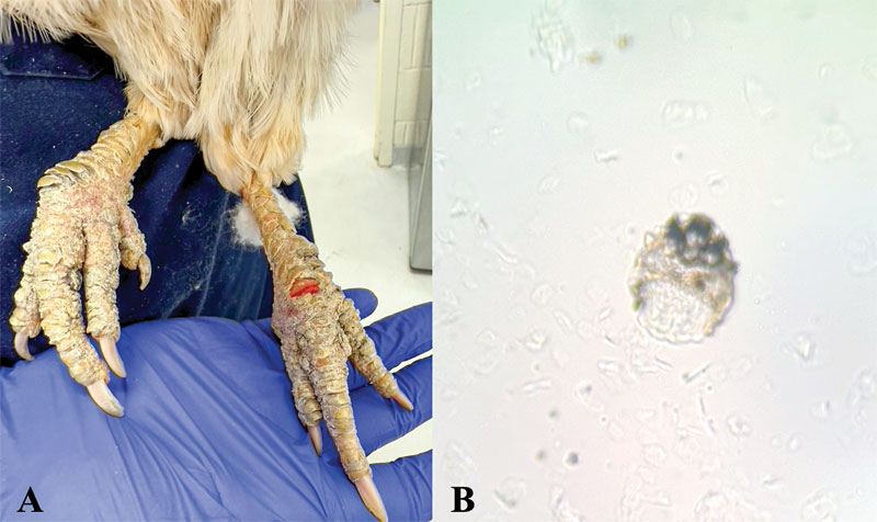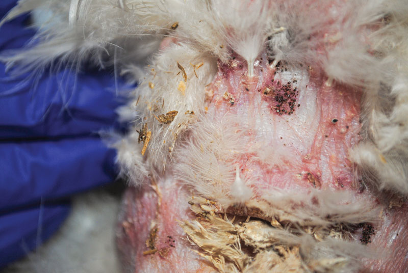 Backyard poultry ownership in the United States has increased dramatically in the last couple of years, with an estimated total of 85 million backyard chickens. In the United Kingdom, backyard chickens have overtaken rabbits as the third most popular pet.1 Backyard poultry are often considered pets by their owners, but they are also considered a major food-producing species in the U.S., along with cattle, pigs, and turkeys. Therefore, they are also subject to additional federal/state regulations, including those related to topical or systemic medications. Importantly, these regulations hold true regardless of the owner’s perception of their chicken’s role, whether pet or food-producing animal. According to a survey of backyard poultry owners, 57 percent stated their chickens were solely kept as pets, but their eggs were consumed.2 As a vast majority of backyard poultry live outdoors in a variety of different coops, ectoparasites are very common. According to one survey of backyard poultry on the West Coast of the U.S., 61 percent of all chickens examined at multiple farms had at least one ectoparasite.3 Let’s review the most common ectoparasites of backyard hens and treatment options in the United States, as laws regarding the treatment of food animals, including chickens, vary from country to country. Lice Lice are one of the most prevalent ectoparasites of U.S. backyard poultry flocks, according to several published surveys.3,4 In fact, 97 percent of all ectoparasites collected from poultry in one survey were lice, and only three percent were mites.3 The two most common are the chicken body louse (Menacanthus stramineus) and the shaft louse (Menopon gallinae).5 These lice are 3- to 6-mm long, with a flattened, ovoid body shape (Figure 1). As both are chewing lice, they do not take blood from the host; instead, they feed by chewing feathers and the skin around the feather base. All portions of their life cycle occur on the host bird, and eggs (nits) often are seen as white clumps at the base of the feather shafts (Figure 1). Figure 1. Numerous lice on a chicken’s skin. Note the large accumulations of white nits (eggs) on the base of the feathers. Photo courtesy Dr. Coby Schal Interestingly, the presence of lice often limits the prevalence of mites.6 Unlike other ectoparasites, lice can be found all over the host bird, and not in a particular location. Poultry lice have a predilection for poultry but can infect other birds if their preferred host is unavailable. They are not zoonotic and will not survive on humans or other mammals.5 Birds are often asymptomatic for mild lice infestations, but dermatitis, poor feather quality, and reduced egg production can be seen for more significant infestations, which tend to be worse in the fall and winter months.7 Lice can be easier to treat than mites due to their longer life cycle and short life span off the host.5 Poultry lice do not serve as vectors for any pathogens known to date. Beak trimming to prevent conspecific aggression in backyard poultry flocks is less common than in commercial flocks, which are often housed in close proximity to one another. However, chickens with trimmed beaks often have higher loads of ectoparasites (mites and lice) than chickens with normal beak occlusion.8 Mites The three most common mites of backyard chickens are the northern fowl mite (Ornithonyssus sylviarum), the chicken mite or red mite (Dermanyssus gallinae), and the scaly leg mite (Knemidocoptes mutans). While lice are more prevalent in backyard flocks, mites, particularly the northern fowl mite, have more significant health implications for both commercial and backyard poultry flocks.5,6 Northern fowl mite The northern fowl mite is less than 1-mm long but is still visible with the naked eye as a tiny mobile black dot that may appear redder in color after feeding (Figure 2). They spend their entire life cycle on the host and can infect both domestic and wild birds. Figure 2. Multiple clusters of northern fowl mites (Ornithonyssus sylviarum) on the skin of a chicken just dorsal to the vent. Photo courtesy Dr. Olivia Petritz Northern fowl mites prefer cooler temperatures and thus are most often found around the vent and uropygial (preen) gland. They also tend to be more of a problem in the fall and winter months in temperate climates.5 Survival times off the host are minimal (seven to 35 days under optimal conditions) compared to other mite species, and transmission via wild birds and fomites is common. These mites are not considered zoonotic, but they can be found crawling on people handling infested chickens, so appropriate precautions should be taken. As these feed on blood, severe infestations can lead to clinically important anemia in addition to localized dermatitis and overall reduced egg production (10-15 percent in commercial flocks).6 It is estimated heavy infestations with this mite can lead to a six percent total body blood loss each day.6 A recent study evaluated chicken behaviors following experimental infestation with northern fowl mites compared with control flocks.9 Unsurprisingly, mite infestations increased preening behavior and the presence of skin lesions, but the authors stressed the potential negative impacts both of these findings could have on animal welfare. Chicken mite The chicken mite (Dermanyssus gallinae), also known as the red mite or roost mite, is another common mite and can also infect other birds. Similar to the northern fowl mite, the chicken mite is not considered zoonotic. Humans and all mammals can have transient infections, but are not competent hosts. These mites are also approximately 1-mm long and can appear black or red following feeding. However, chicken mites spend the majority of their time off the host and only feed on chickens at night. This strategy makes them much more difficult to eradicate from chicken houses and coops, as they can survive in the environment for up to six months without feeding.5 