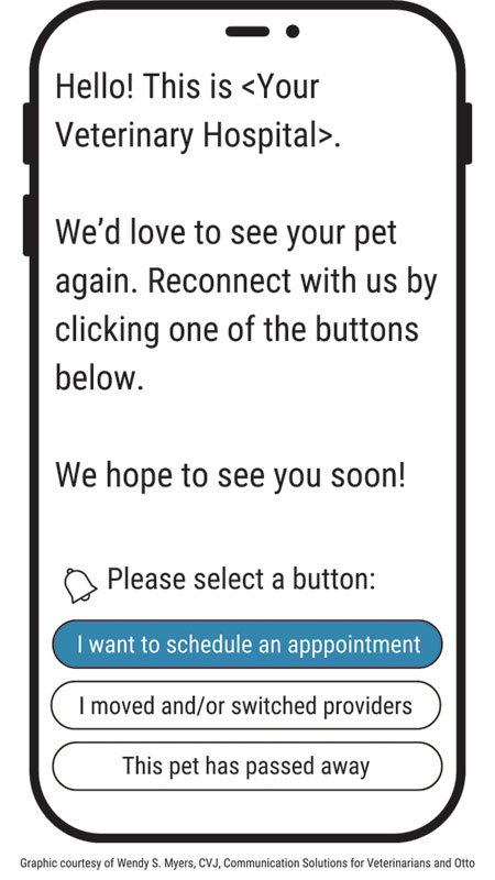After several years of overloaded appointments, many practices are facing same-day openings. Because full schedules ensure healthy profits, your client service representatives (CSRs) should aim for zero empty slots. While a waitlist will fill last-minute openings, contact clients with overdue pets to ensure full schedules. Use a combination of calls, texts, and emails to reach clients who got sidetracked on their pets’ preventive care. Lapsed patients that have not received care in 14 to 18 months represent an average of 20 percent of a practice’s active patient count.1 After 18 months, it is challenging to get them back. An uptick in overdue pets indicates your patient base is shrinking and clients need to reconnect with your hospital. Remind clients of your primary role in their pets’ preventive care and how much they mean to your practice. Increasing client retention rates by five percent can lead to a 25 percent to 95 percent rise in profits.2 Clients need a series of notices to prompt them to return to your hospital for wellness services. Recalls are messages sent to clients whose pets are due for care but have not yet scheduled appointments. Send clients up to five scheduling recall notices. Your goal is to get most clients to respond before due dates. Start your re-engagement program when patients are 30 days overdue for wellness services (Table 1). Recall notice When sent Method 1st scheduling recall 60 days ahead Text and email 2nd scheduling recall 30 days ahead Text and email 3rd scheduling recall 14 days ahead Text and email 4th scheduling recall On due date Text and email 5th scheduling recall 30 days past due Call, text, and email Focus on newly overdue patients Do not run a report in your practice information management software (PIMS) of pets overdue 14 to 18 months for wellness services and ask CSRs to call thousands of clients on the list. This overwhelming task will get poor results. If you have not seen patients in 18 months, you may never see them again.3 The veterinary-client-patient relationship is likely over, and clients have moved on. Target clients with pets 30 days past due because they recently received four notices. Your practice will still be top of mind. Call clients with overdue pets daily CSRs need a manageable list of clients to call—just a day’s worth. For example, run a report in your PIMS on May 1 for patients overdue for wellness services on April 1. If you have 12 clients on the report and four CSRs, each will call three clients—an easy task. If you talk to the client, say, “This is calling for the doctors at . is now overdue for an exam, vaccines, diagnostic tests, and preventatives. We’re worried about his/her health. Our next available appointments are <date, time 1> or <date, time 2>. Which do you prefer?” The phrase “calling for the doctors” communicates your veterinarians are aware of the pet’s overdue status and are genuinely concerned. Present the next two available appointments, using the two-yes-options technique to lead clients to book now. Do not ask, “Do you want to make an appointment?” because you give clients the option to say no. When describing overdue preventive care, highlight four categories: Exam Vaccines Diagnostic tests Preventatives Clients may hesitate to schedule if you describe too many services. Simply say the pet is overdue for diagnostic tests rather than specifics of an intestinal parasite screen, heartworm/tick screen, and senior early detection screen. If you get the client’s voicemail, leave this message: “This is calling for the doctors at . We are concerned that is overdue for an exam, vaccines, diagnostic tests, and preventatives and may now be unprotected. Please call us this week at 555-555-5555 to schedule an appointment. I also will text you a link to book online.” The warning “may now be unprotected” is a call to action. Asking clients to return your call this week gives them a deadline and creates urgency. Be aware of your tone of voice. Expressing compassion will get clients to return your calls. If business has slowed or CSRs have extra time, call clients with pets three to six months overdue; however, your team may not experience the same number of successful responses compared to newly overdue patients. Follow up with texts and emails Because 67 percent of people do not listen to voicemails, send texts as backup communication.4 Your text should include a reminder about the overdue visit, payment plans, and options to book an appointment (Figure 1). Figure 1. Grab readers’ attention with all caps, which are like shouting in a text or email. Because emojis can increase open rates by 56 percent, use a syringe emoji to illustrate vaccines.5 Get free emojis of dogs, cats, mosquitoes, pawprints, pills, veterinarians, syringes, stethoscopes, and more at https://getemoji.com. Use a colored button to highlight the action you want clients to take first. Buttons increase click-through rates by 15 percent over hyperlinks.6 Buttons offer yes-or-yes choices of “Book online now,” “Call to schedule,” or “Remind me later.” If clients choose to be reminded later, send them another text and email in seven days. Wellness plans with monthly payments remove financial obstacles and may motivate clients to return. A study found 55 percent of wellness plan members visit practices more often, and 47 percent have a higher average charge per transaction.7 Wellness plans are a smarter business strategy than discounts to lure clients back. After getting the “sale price” by returning for preventive care, pet owners may delay future services until they get the next deal. Because 62 percent of emails are opened on mobile devices, have a short subject line with a call to action such as “Your pet is OVERDUE Book immediately.”8 To fit the subject line on mobile view, stay within 30 to 40 characters, including spaces. Have a stethoscope or vaccine emoji to boost open rates. “B