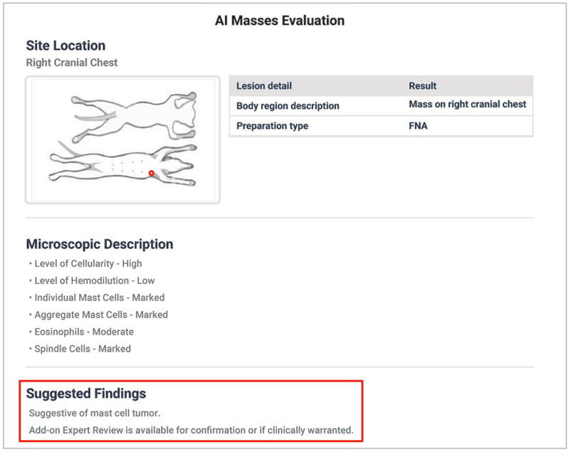 The veterinarian performed a fine needle aspirate and used the Vetscan Imagyst platform to scan the sample. Within minutes, AI Masses flagged the presence of mast cells, suggesting a mast cell tumor, one of the most common skin tumors in dogs. The veterinarian requested an expert review through the platform, which confirmed the preliminary findings.