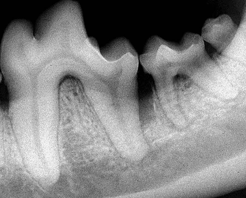 Figure 1: Generalized horizontal bone loss of teeth 405, 406, and 407. Teeth 405 and 406 will likely require extraction due to the severity of bone loss, root exposure, and furcation involvement. Photos courtesy John Lewis