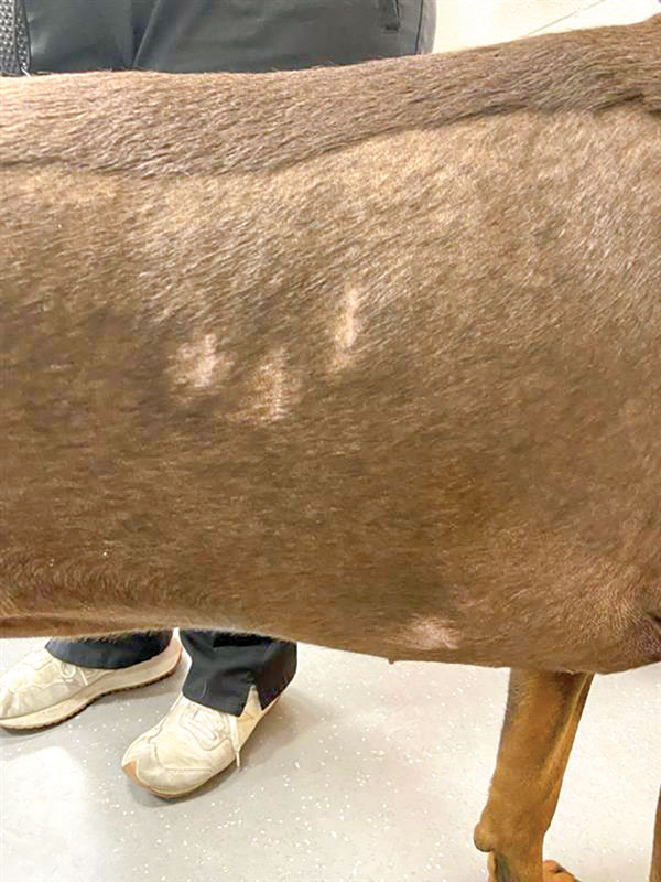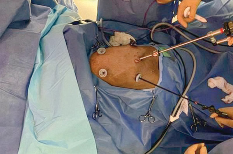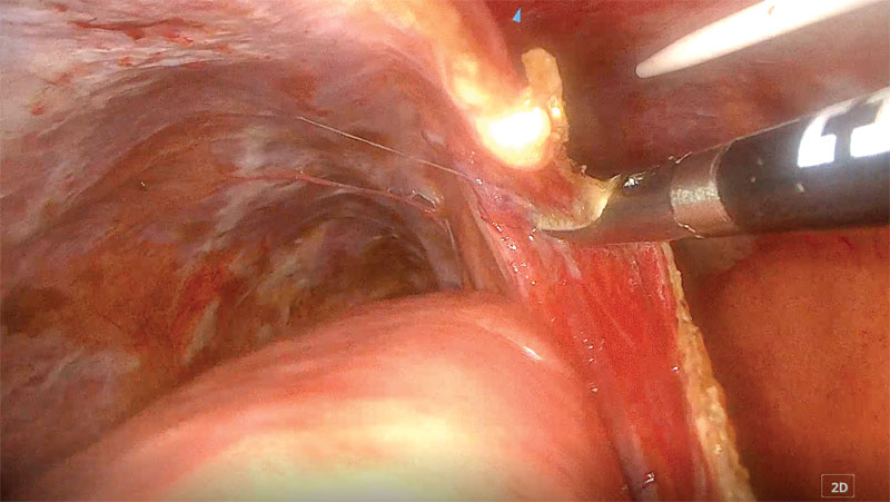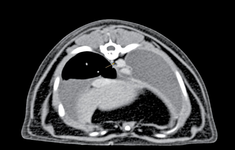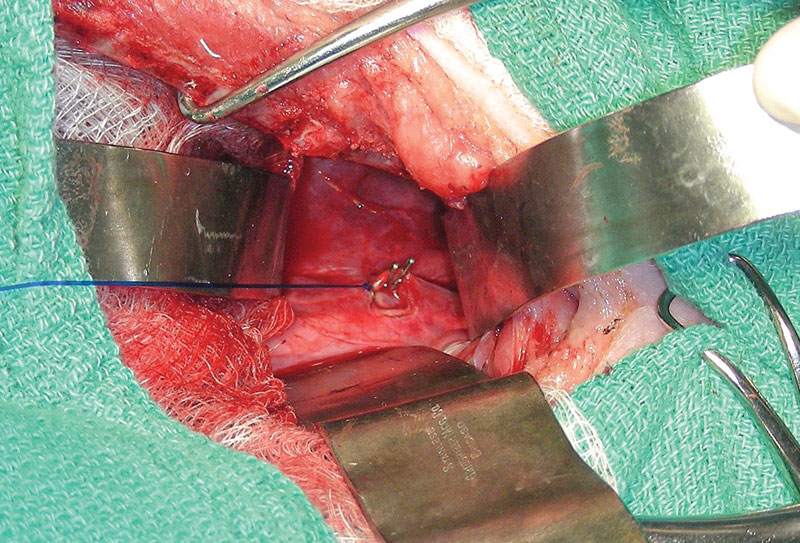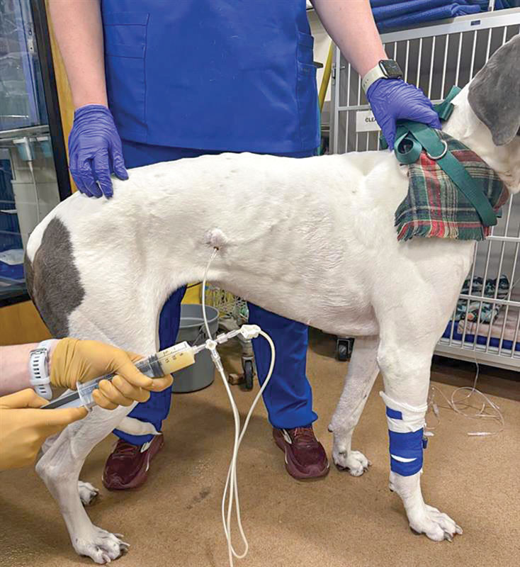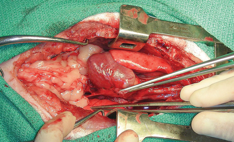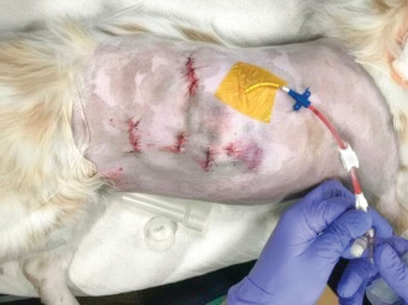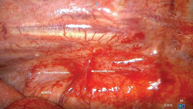 Chylothorax is a complex disease process that affects both dogs and cats. It occurs when chylous effusion accumulates within the thoracic cavity. Chylous fluid consists of lymphocytes, protein, and triglycerides.1-3 Chylothorax has many underlying possible etiologies that ultimately cause decreased drainage of the thoracic duct, increased lymphatic burden, or both. It can be secondary to infection (parasitic, fungal), mediastinal masses, congenital conditions, lung lobe torsion, heart-based tumors, iatrogenic trauma, and thrombosis, among others.3-5 When a definitive cause cannot be identified, the condition is considered primary, or idiopathic. Treating chylothorax typically involves either medical or surgical management. Medical management aims to decrease the amount of lymphatic fluid excretion while increasing the absorption and removal of accumulated pleural fluid. Medications commonly used include rutin, a supplement that increases lymphatic fluid absorption6,7 and octreotide, which reduces lymphatic fluid excretion. A nutritional change to a lower-fat diet may decrease the amount of chylous fluid production and transport through the thoracic duct.3 Drainage of pleural effusion via thoracocentesis or placing temporary thoracostomy tubes is used to aid in patient respiration and clinical signs secondary to the pleural effusion. Surgical management of secondary chylothorax targets treatment of the underlying condition. In cases deemed idiopathic, surgical intervention is recommended after failed medical management. The mainstay of treatment is ligation of the thoracic duct.1,2,8 Additional procedures can include pericardiectomy and cisterna chyli ablation.1,2 Adjunctive procedures to aid in removal of pleural effusion include thoracic omentalization,9 pleuro-peritoneal shunt creation,10 and pleural port placement.11,12 Surgical outcome for chylothorax in small animal patients is highly variable, with the prognosis more guarded in cats than in dogs.1,13 Traditional surgical interventions for idiopathic chylothorax are highly invasive, typically requiring open chest surgery (Figures 1 and 2) with the possibility of added abdominal laparotomy.3,4 Owners may be averse to such highly invasive procedures, with a possibility of nonresolution or continued need for pleural effusion evacuation. The use of minimally invasive surgery in small animals has made advances in the last several decades, and its use has been applied for surgical conditions, such as chylothorax.13-15 Figure 1. Thoracic duct ligation in a cat using the traditional intercostal thoracotomy approach. Photo courtesy Dr. Eric Monnet. Figure 2. Subtotal pericardiectomy in a cat via median sternotomy. Also shown is the transthoracic omentalization. Photo courtesy Dr. Eric Monnet Advantages of minimally invasive surgery in small animals have been well described in the literature, including quicker healing time, smaller incision size with inherent decreased incisional complications (Figures 3 and 4), quicker time to discharge, and less post-operative pain.16-19 Advances in using high-level imaging concurrently with minimally invasive techniques have improved pre- and intra-operative planning for chylothorax and acceptable outcomes. Summarized are the four most common components of surgical management of chylothorax via minimally invasive surgery. Figure 3. The incisions present after a minimally invasive surgery for idiopathic chylothorax. There are three thoracoscopic port incisions for the thoracic duct ligation, a paracostal incision for laparoscopic ileocolic access for ICG administration, and an incision created for pleural port placement. Photo courtesy Dr. Sarah Marvel Figure 4. Healed thoracoscopic port incisions after thoracic duct ligation illustrating the size contrast to a standard open chest procedure. Photo courtesy Dr. Claire Takeshita Thoracic duct ligation The thoracic duct is the primary lymphatic vessel that allows for lymphatic drainage from the majority of the body and into the venous system. The thoracic duct originates from the cisterna chyli, a lymphatic network, located ventral to the lumbar vertebrae residing in the retroperitoneal space. The thoracic duct then travels cranially through the aortic hiatus in the diaphragm and into the thoracic cavity. The thoracic duct is typically located on the right dorsolateral surface of the aorta in dogs and on the left side in cats. The thoracic duct then empties into the left external jugular vein or jugulosubclavian angle.20 Thoracic duct ligation is the primary treatment for chylothorax. The thoracic duct is ligated within the thoracic cavity to decrease leakage in the pleural cavity. Ligation of the thoracic duct allows for new anastomoses to be created outside the thoracic cavity between the lymphatic and venous systems. Thoracic duct ligation can be performed via a traditional open approach, using a right-sided 10th intercostal thoracotomy approach in dogs or a left-sided 10th intercostal thoracotomy approach in cats. Ligation of the thoracic duct is performed via ligation of all the structures dorsal to the aorta and ventral to the sympathetic trunk using suture, hemoclips, or a vessel sealing device. Prior to surgery, advanced imaging in the form of a CT scan combined with lymphangiography can be performed to better understand each patient’s individual anatomy of the thoracic duct. Recent literature has described variations in the configuration of the thoracic duct among patients.21,22 Higher success rates may be achieved with patient-specific surgical planning, as additional branches and their location can be better identified (Figure 5). For the thoracoscopic approach to the thoracic duct, pre-operative imaging and planning are crucial for patient positioning and ideal port placement. Figure 5. A CT scan image showing the thoracic duct located to the right of the aorta in a cat. This finding illustrates the benefit of advanced imaging for surgical planni