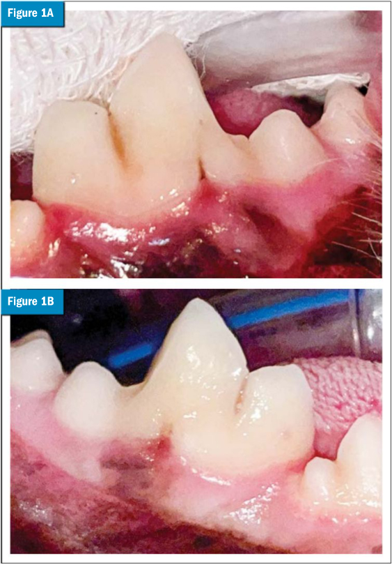 Tooth 309 (A) and tooth 409 (B) exhibit an enamel fissure in the furcational enamel which is a hallmark sign of a developmental abnormality often referred to as dens invaginatus.Photos courtesy John Lewis Chelsey, a seven-year-old spayed cockapoo, recently presented for extraction of her left mandibular first molar tooth (tooth 309) that was diagnosed with endodontic disease on dental radiographs that were taken by her primary care veterinarian. On inspection of tooth 309, there was no evidence of tooth fracture or discoloration of the tooth, but there was a subtle abnormality of the crown that revealed the cause of the endodontic disease. I noticed a slight notch in the crown dorsal to the furcation of tooth 309, sometimes referred to as an enamel fissure. Inspection of tooth 409 showed a similar enamel fissure (Figures 1 A, B). The patient was placed under general anesthesia, and dental radiographs were obtained. Abnormalities of tooth 309 included increased radiodensity in the furcation area of the pulp chamber, and large periapical lucencies of both the mesial and distal roots (Figure 2). Tooth 409 showed increased radiodensity in the furcation pulp chamber and periapical lucency of the mesial root. Dens invaginatus These clinical and radiographic findings are consistent with what the literature has described in a handful of case reports and case series as “dens invaginatus,” also referred to as “dens in dente.” Dens invaginatus is a malformation of teeth likely resulting from an infolding of the dental papilla during tooth development. Teeth affected by dens invaginatus show a deep infolding of enamel and dentin. The tooth most affected in people is the maxillary lateral incisor, which may occur bilaterally. The malformation shows a broad spectrum of morphologic variations and frequently results in early pulp necrosis. Root canal therapy may be difficult or impossible in some cases due to the abnormal anatomy of the teeth.1 In dogs, dens invaginatus has been described in a Doberman pinscher,2 mixed breed dogs,3,8 Jack Russell terrier,4 Rottweiler,5 German shepherd,6 Irish setter,7 Cavalier King Charles spaniel,8 miniature pinscher,8 and other breeds. The mandibular first molar is the most commonly affected tooth, but it has been described in a maxillary first molar5 and the maxillary canine tooth.6 Clinically, I see the disease most commonly in the mandibular first molar of little white fluffy dogs, such as Maltese and Havanese breeds. This is not an uncommon finding: I likely see 10 cases in some years. A developmental abnormality Now that I may have introduced what may be a new disease to you, it is worth mentioning a recent publication suggests this developmental abnormality in mandibular first molars is not due to dens invaginatus, but rather due to some other developmental abnormality.8 Assessment of mandibular first molar malformations in six dogs did not definitively determine the cause of disease, but micro-CT and histopathology suggest the abnormalities seen more closely resemble a condition documented in humans called molar-incisor malformation. Similar to what we see in our veterinary patients, molar-incisor malformation, also referred to as molar-incisor hypomineralization, a hypoplastic enamel notch is seen near the cervical third of the clinical crown.9 Based on this recently obtained information, the authors suggested veterinarians refer to these affected teeth as having “carnassial tooth malformations.”8 Regardless of what you call it, look for molar malformations that may be harboring current or future endodontic problems, particularly in the little white fluffy dogs! Figure 2A (left): Tooth 309 in a seven-year-old cockapoo. Note the increased radiodensity within the pulp chamber and periapical lucencies of both the mesial and distal roots. Figure 2B (right): A more severely affected tooth 309 in a different dog. Note the convergence of the normally divergent roots. John Lewis, VMD, DAVDC, FF-AVDC OMFS, practices and teaches veterinary dentistry and oral surgery at Veterinary Dentistry Specialists and Silo Academy Education Center, both located in Chadds Ford, Pa. References Hülsmann M. Dens invaginatus: aetiology, classification, prevalence, diagnosis, and treatment considerations. Int Endod J. 1997;30(2):79-90. DeForge DH. Dens in dente in a six-year-old Doberman pinscher. J Vet Dent. 1992;9(3):9,12. Duncan HL. Diagnostic imaging in veterinary dental practice. Dens invaginatus leading to arrested maturation of the right and left mandibular first molar teeth. J Am Vet Med Assoc. 2010;237(11):1251-3. Stein KE, Marretta SM, Eurell JA. Dens invaginatus of the mandibular first molars in a dog. J Vet Dent. 2005;22(1):21-25. Assunção GSM, Ocarino NM, Sofal LC, Serakides R. A Rare Case of Radicular Dens invaginatus (dens in dente) in a dog. J Comp Pathol. 2020;178:46-49. Coffman CR, Visser CJ, Visser L. Endodontic treatment of dens invaginatus in a dog. J Vet Dent. 2009;26(4):220-225. Pavlica Z, Erjavec V, Petelin M. Teeth abnormalities in the dog. Acta Vet Brno. (2001) 70:65–72. Ng KK, Rine S, Choi E, Fiani N, Porter I, Fink L, Peralta S. Mandibular Carnassial Tooth Malformations in 6 Dogs-Micro-Computed Tomography and Histology Findings. Front Vet Sci. 2019;6:464. Lee HS, Kim SH, Kim SO, Lee JH, Choi HJ, Jung HS, Song JS. A new type of dental anomaly: molar-incisor malformation (MIM). Oral Surg Oral Med Oral Pathol Oral Radiol. 2014;118(1):101-109.
