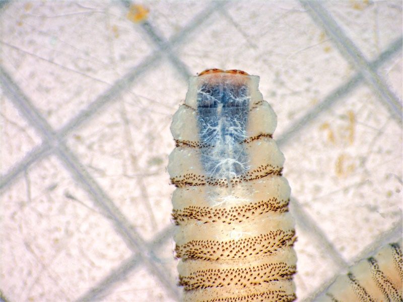 A close-up shot of an NWS larva (maggot), with the first one showing its mouth hooks. Photo by the U.S. Department of Agriculture (USDA)