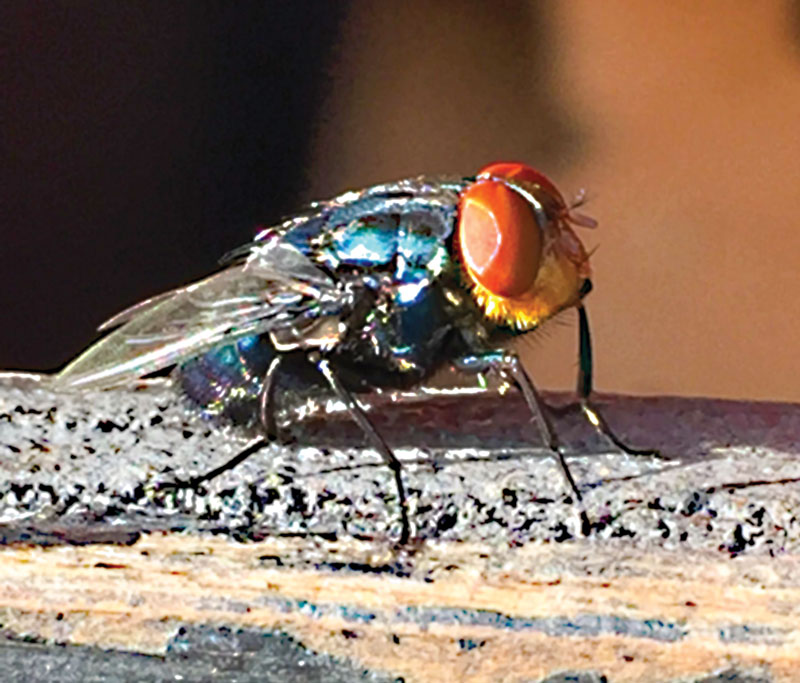 Cochliomyia hominivorax, the NWS, represents the only fly species whose maggots feed on living, not dead tissue. The larvae of this fly species burrow into and feed on living tissue, causing not only painful injury, but also potentially fatal consequences. The flies are slightly larger than the common housefly. With three darkened stripes across their back, a green or blue body, and orange eyes, their larvae screw into a wound, noshing all the way.1