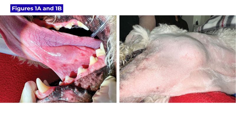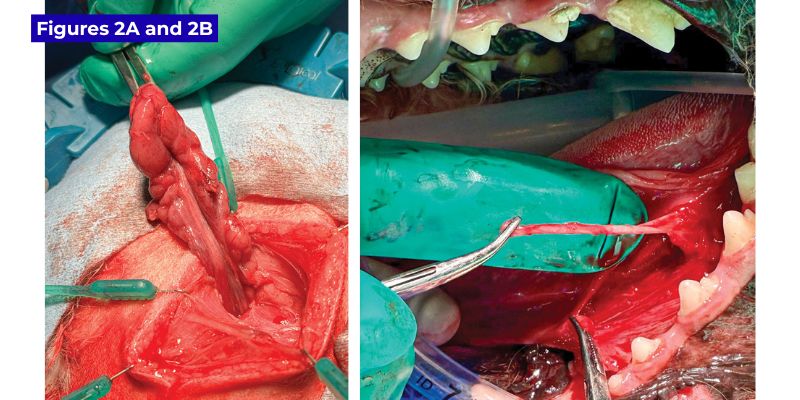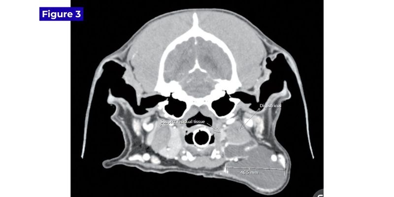 Sialoceles are not common in dogs and are even rarer in cats. A sialocele is an abnormal accumulation of saliva, resulting in a compressible swelling in the neck. Another term that has been used to describe this condition is salivary mucocele. However, since our veterinary patients produce a combination of mucous and serous salivary secretions, sialocele may be a more appropriate term.1 This disease occurs most commonly in dogs, and its etiology is thought to be a result of trauma to the duct of a monostomatic gland, resulting in extravasation of saliva into the subcutaneous and submucosal tissues with formation of a pseudocyst. However, ineffective attempts to experimentally create sialoceles2 and breed predilections (poodles)1 suggest other factors, such as genetics, may play a role. I have seen a few cases of sialoceles in dogs with concurrent sialoliths: the rough surface of sialoliths may irritate and cause damage to the duct system. Especially if the sublingual gland is involved, a ranula (sublingual sialocele) may occur in conjunction with, or in the absence of, a cervical sialocele. Palpation is a very helpful diagnostic tool, and aspiration of the swelling can be done to obtain more information. Aspiration of a sialocele produces a straw-colored or blood-tinged viscous fluid. This fluid may be submitted for cytology, but the consistency and appearance of the fluid are very telling. Repeated aspiration in attempts to drain the fluid is rarely beneficial and is not recommended since saliva is produced at such a rapid rate; any beneficial results of aspiration are usually transient. Tully’s tale I would like to share a case with you I saw 18 months ago. “Tully,” a seven-year-old male neutered goldendoodle, was presented to his primary care veterinarian for drooling, halitosis, and lethargy that had started two days prior. Oral examination revealed a swelling under the left side of the tongue, odor from the mouth, and a 7 cm x 5 cm x 4 cm fluctuant swelling in the left neck (Figures 1A and 1B). Tully, a seven-year-old goldendoodle, presented with A) sublingual and B) left neck swelling. Photos courtesy Dr. John R. Lewis The neck swelling was aspirated by Tully’s primary care vet, which showed a clear viscous fluid. Though lethargy and odor are rarely seen with sialoceles, everything else supported the diagnosis of cervical sialocele. An antibiotic and carprofen were prescribed by Tully’s primary vet, with no change to the swelling. Tully was referred to me and scheduled for a cone-beam CT scan and removal of the mandibular and sublingual salivary glands on the left side. Though cone-beam CT is not as definitive for assessment of soft tissue lesions as it is for bony and dental lesions, the radiologist’s report of the CT documented a left ventral cervical fluid-filled mass lesion, most consistent with a cervical sialocele, and small mineral-attenuating foci consistent with sialoliths. The swelling was causing compression and rightward displacement of the larynx. Mild left medial retropharyngeal lymphadenopathy was also noted, which was thought to be reactive. Surgery was performed via a skin incision in the neck. The mandibular and sublingual glands were dissected with the intent to remove the entire mandibular and monostomatic portion of the sublingual gland (Figure 2A). A Penrose drain was placed and removed four days later. A) Tully’s first surgery involved the removal of the mandibular and sublingual salivary glands through the neck. B) After recurrence of the sialocele, an intraoral approach wasmade to follow the salivary ducts caudally. Photos courtesy Dr. John R. Lewis A persistent problem Tully’s subsequent rechecks went well, and there were no signs of recurrence. However, 11 months later, Tully was presented with a fluctuant swelling in the left neck area of 4 cm in diameter. Aspiration was consistent with saliva. A second surgery was performed, and this time, an intraoral approach was performed to follow the ducts of the sublingual and mandibular salivary glands to hopefully remove any remnants of the sublingual gland (Figure 2B). Dissection of the duct system did not lead us to a fluctuant pocket of saliva, so an exploratory through the neck incision was also performed during the same procedure. A possible remnant of salivary tissue was identified and submitted for histopathology. Histopathology showed granulomatous and neutrophilic inflammation and fibroplasia, with no evidence of neoplasia or glandular tissue. At Tully’s two-week healing recheck, no evidence of sialocele recurrence was seen, but four months later, a fluctuant left neck swelling recurred. A conventional CT scan was recommended. The conventional CT scan was done at Ryan Veterinary Hospital at the University of Pennsylvania, which ensured saliva was not arising from another salivary gland, such as the parotid or zygomatic gland. CT also identified a possible remnant of sublingual salivary gland, which was approximately 9 mm wide (Figure 3). Axial image from a conventional CT scan with contrast, showing a possible salivaryremnant medial to the digastricus and ventral to the carotid artery. Photo courtesy Dr. John R. Lewis After discussing the situation with Tully’s owners, oral surgeons, soft tissue surgeons, and a radiation oncologist, the owners decided to pursue radiation therapy targeted at the salivary remnant due to concerns that further surgery would be akin to finding a needle in a haystack. Radiation treatment Salivary tissue is very sensitive to radiation, as evidenced by xerostomia that people experience after head/neck radiation. Radiation as a treatment for recurrent sialoceles has been documented in a 2018 manuscript in the Journal of Veterinary Internal Medicine. This manuscript acknowledges that surgery is the first line of treatment, but with a recurrence rate of 5-14 percent3 and the inherent sensitivity of salivary tissue to radiation, its use for treatment of recurren