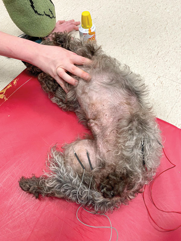Bindo, a small mixed-breed dog, receives electroacupuncture to the left hind limb for medial patellar luxation. Photo courtesy Dr. Adrianna M. Sage