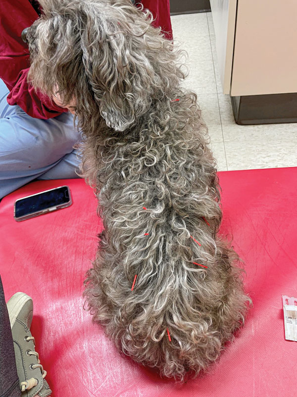 Hind limb problems can result in tension in the neck and shoulders. Here, Bindo receives dry needling along the caudal back and hips for secondary myofascial strain. Photo courtesy Dr. Adrianna M. Sage