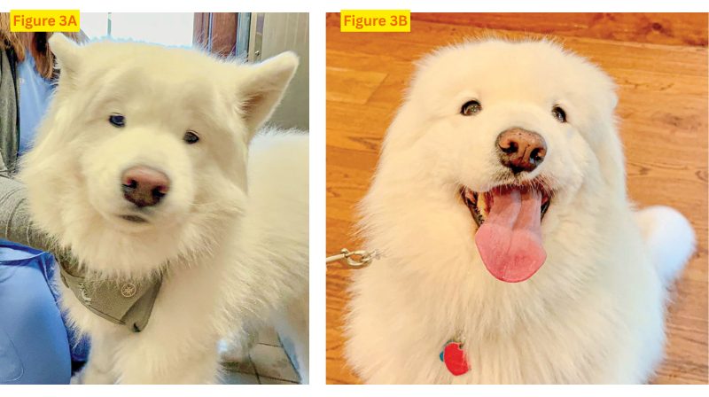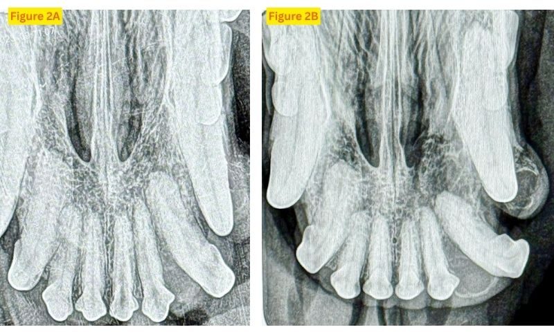 Presentation and initial examination We first met Zoey, a female spayed Samoyed, two years ago, when she was eight years old. Her owner noted an oral mass in the left rostral maxilla. The mass was arising from the palatal gingiva of tooth 203, possibly extending to the buccal surface of tooth 203 and the adjacent canine tooth 204 (Figure 1). The palatal component was slightly ulcerated and approximately 1 cm in diameter with a broad base. Tooth 204 had a crown fracture with pulp exposure. Figure 1. Gingival mass arising from the gingiva palatal to tooth 203 and buccal to tooth 204 in an eight-year-old female spayed Samoyed. Note generalized gingival hyperplasia of all maxillary incisors and complicated crown fracture of tooth 204. Photo courtesy Dr. John R. Lewis We recommended an incisional biopsy to determine what type of tumor Zoey had. Zoey was placed under general anesthesia, and full-mouth dental radiographs were obtained. Radiographs showed a mildly increased interdental space between 202 and 203 due to a soft tissue density and mild lysis at the alveolar margin (Figure 2). Soft tissue swelling was also noted lateral to tooth 204. Biopsies were obtained from the palatal portion of the mass and the buccal surface of 204. Histopathology returned as marked reactive mucosal hyperplasia with dysplasia and marked mixed inflammation. Seeking a second opinion Since the diagnosis did not match our clinical suspicions, we requested a second opinion from another pathologist. The second pathologist diagnosed the biopsies from the swelling around tooth 203 as moderate to severe ulcerative chronic active gingivitis with granulation tissue. Histopathology of the enlarged gingiva buccal to tooth 204 showed fibrogingival hyperplasia. After receiving the results of this second opinion, we had a discussion with Zoey’s owner. Based on clinical appearance, we still suspected a tumor over inflammatory or hyperplastic causes. We initially biopsied only soft tissue and, therefore, suspected a deeper biopsy that included tooth and bone may be warranted. Prior to that, we wanted to rule out an inflammatory disease that can mimic neoplasia: Wegener’s granulomatosis, a.k.a. granulomatosis with polyangiitis.1 This is a rare condition that can result in severe ulceration and red, raised tumor-like growths. Histopathology of this condition reveals granulomatous inflammation, which is different than the granulation tissue seen in Zoey’s samples. Granulomatous inflammation is defined by the presence of mononuclear leukocytes, specifically histiocytes (macrophages), which respond to various chemical mediators of cell injury. Through light microscopy, the activated histiocytes appear as epithelioid cells with round to oval nuclei, often with irregular contours and abundant granular eosinophilic cytoplasm with indistinct cell borders. They may also coalesce to form multinucleated giant cells.2 Granulomatosis with polyangiitis is not a common disease: I have seen probably less than 10 cases over 25 years. However, when I saw it, it has always been very responsive to steroid treatment. So, we placed Zoey on a two-week trial of prednisolone at a dose of 0.5 mg/kg every 12 hours. After two weeks of therapy, a recheck examination showed no evidence of shrinkage of the swellings. Therefore, Zoey was tapered off the prednisolone, and a second biopsy procedure was scheduled. Diagnosis At the second biopsy procedure, we biopsied the swelling palatal to tooth 203 and placed it in a cassette labeled “superficial.” We also removed tooth 203 and submitted it within the biopsy jar and obtained deeper bone and soft tissue samples from the area of the extracted tooth. These samples were placed in a cassette labeled “deep.” This more aggressive biopsy allowed us to obtain an accurate diagnosis: cystic conventional ameloblastoma. Zoey was then scheduled for a cone-beam CT scan and maxillectomy. The maxillectomy included teeth, bone, and soft tissue of the rostral maxilla, extending from tooth 206 on the left across the midline to tooth 102 on the right side. The portion of the maxilla was submitted to the pathologist, who confirmed the diagnosis and determined the margins were clean. Acanthomatous ameloblastoma is a very common odontogenic oral tumor in dogs. It represents up to 45 percent of all odontogenic tumors,3 but conventional ameloblastoma, also referred to as “solid/multicystic,” “central,” or “intraosseous” ameloblastoma, is a rare diagnosis. Both arise from cells responsible for the formation of the teeth, but acanthomatous ameloblastoma arises at the gingival margin, whereas conventional ameloblastoma arises deeper in the periodontium and can mimic a multilocular cyst. Though the radiographs taken at the time of the first biopsy showed no evidence of a cystic component, radiographs taken two months later showed at least two distinct cystic areas with a classic corticated rim of surrounding bone (Figures 2A and 2B). Gingival mass arising from the gingiva palatal to tooth 203 and buccal to tooth 204 inan eight-year-old female spayed Samoyed. Note generalized gingival hyperplasia of allmaxillary incisors and complicated crown fracture of tooth 204. Photos courtesy Dr. John R. Lewis Key takeaway This case is a good reminder that sometimes deeper biopsies are needed. If the pathologic diagnosis does not fit with the clinical picture, consider a deeper dive. We recently saw Zoey for a two-year anesthetized exam and radiographic recheck and are happy to report she is doing wonderfully. Though she looks a little different than she once did (Figures 3A and 3B), her zest for life and functionality are off the charts. A) Preoperative photo. B) Two years after her maxillectomy, Zoey is still her happy self. Photos courtesy Dr. John R. Lewis John R. Lewis, VMD, FAVD, DAVDC, practices at Veterinary Dentistry Specialists and teaches at Silo Academy Education Center, both in Chadds Ford, Pa. References https://w