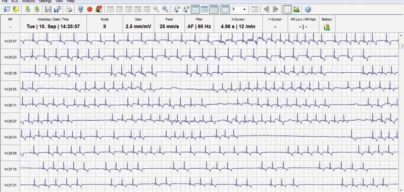 A direct chest lead ECG. The patient is in right lateral recumbency, not because it is necessary, but it was patient preference. The ECG has been a routine test in veterinary practice for decades, and is commonly used for diagnostic purposes, as well as an anesthesia and critical-care monitoring tool. Although the principles of ECG diagnosis remain the same, the ways in which an electrocardiogram can be recorded have changed in recent years. Some of the changes in technology now allow general practices to have access to services that were previously only provided by specialty clinics. Some of the newer technologies also allow screening ECGs to be obtained easier and faster than their conventional counterparts. Why get an ECG? When obtaining a “standardized” ECG, we generally have been taught to use alligator clips and to place the patient in right lateral recumbency. This, of course, requires time and generally two people: one to restrain the animal and the other to run the machine. Further, this technique generally is not amenable to exam room use. A newer option is to consider using a direct chest lead. To decide which technique is best for a particular clinic, it is important to know what ECGs can be used for. The simplest and most important feature of an ECG is it allows a definitive rhythm diagnosis and it determines if there are any conduction defects. In theory, ECGs may also offer information regarding heart size and mean electrical axis—it is specifically for these determinations that a standardized ECG is needed. It would, of course, be very useful if this were the case; however a study we performed at the University of Saskatchewan’s Western College of Veterinary Medicine in Canada showed that sensitivity for cardiac enlargement was generally poor, though specificity was good in some cases. We found tall P-waves that are supposed to identify right atrial enlargement have only a 10 to 20 percent sensitivity, though specificity was almost 90 percent.1 With some practice, it is possible to get a good diagnostic ECG to make a rhythm diagnosis with a direct chest lead in a matter of minutes, which makes this technique ideal for routine screening purposes. The more ECGs you write, the more confident you will become with this diagnostic technique. When selecting any ECG with or without direct chest lead capabilities—especially if the machine is predominantly meant for use on humans—it is vital a 50-mm/sec paper speed printout can be generated. Many of the non-veterinary-dedicated machines only print at 25 mm/sec, which makes diagnosis very difficult in small-animal patients, as they have much higher heart rates than humans. It is also ideal if the ECG unit has the capability to not only do direct chest lead ECGs, but also can support a set of alligator clips in case the direct chest lead tracing is suboptimal. Anesthesia and critical-care monitoring Holter monitor data from a Schnauzer with a history of collapse episodes. Longest pause on this tracing is more than five seconds in duration. Electrocardiography plays an important role in anesthesia and critical-care monitoring. Multiparameter anesthesia monitors are widespread, so it is quite common to monitor ECGs during anesthesia. Although monitoring during anesthesia is important, there is value in continuing to monitor the ECG in the recovery phase. This is certainly true in critical patients (gastric dilatation-volvulus [GDV], splenectomy, trauma, etc.) where serious arrhythmias are not uncommon; however, it also applies to relatively healthy patients. Several studies have shown that, independent of the anesthetic protocol used, even healthy dogs can have significant arrhythmias, though they generally do not result in clinical signs.2,3 In many cases, postoperative or critical-care ECG monitoring was accomplished by use of alligator clips and a clinic’s multiparameter anesthesia monitor set up next to the patient’s cage. The disadvantage to this is the clips can detach with movement or the patient can start chewing on the wires. With the newer monitors and Bluetooth-enabled ECG units, it is now possible to have telemetry, which allows the ECG to be monitored without wires or alligator clips, and either projected on a screen or a tablet. The leads are attached via sticky pads and the unit is bandaged on. An alternative is to use a holter suit to keep the leads and the unit protected. The ECG is saved in a database so it can be reviewed for any abnormalities. These systems do not have software that identifies arrhythmias with ease, so manual review is needed; however, it is possible to do this fairly rapidly when needed. Holter monitoring is a valuable tool in some patients as well, and newer products allow this technique to be carried out in most practices. Holter monitoring is especially useful in breeds that are predisposed to arrhythmias, such as boxers and Dobermans. In boxers, arrhythmias are often the only sign of arrhythmogenic right ventricular cardiomyopathy (ARVC) a.k.a. “boxer cardiomyopathy.” Heart failure tends to develop late, if ever. Diagnosing ARVC is important in breeding animals, as it is heritable. In Doberman pinschers with dilated cardiomyopathy (DCM), arrhythmias occur about a year before ultrasound changes are seen or about two years before heart failure occurs. As such, holter monitoring is a vital test in early DCM and ARVC diagnosis. In most cases, holter monitoring in general practice is accomplished by renting a unit from a company and then sending it back for evaluation. Given the logistical issues with this and the turnaround time, holter monitoring is rarely done in practice. It is now, however, possible to obtain veterinary-specific holter monitors with appropriate software. These units also are Bluetooth-enabled, and when they are not being used as a holter, they can be used for in-clinic telemetry. In those practices where using a holter does not make sense, it is possible to 
